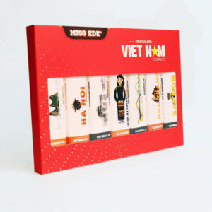 The Vietnam Collection Set features both milk chocolate and dark chocolate bars. Each bar is uniquely stamped with the name of a famous Vietnamese tourist destination: Hanoi, Ha Long, Hue, Da Nang, Buon Ma Thuot, Nha Trang, and Saigon (Ho Chi Minh City). It’s a delightful mini travel guide to the captivating beauty of Vietnam, packaged in a sweet way.
